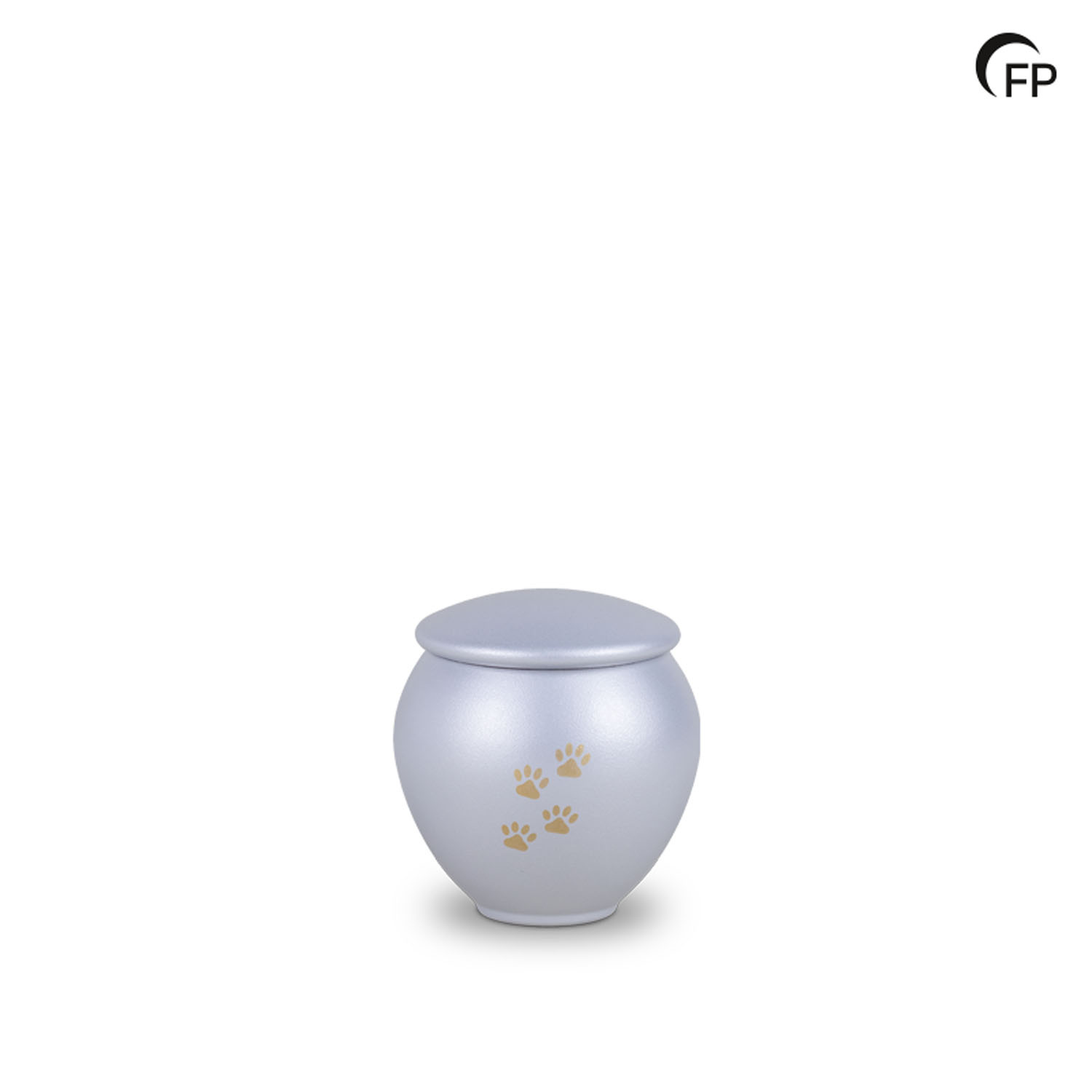 Diese kleine Metall-Tierurne in Grau (Silverglow) bewahrt ein elegantes, respektvolles Andenken an ein geliebtes Haustier. Die goldfarbenen Pfoten verleihen ihr einen raffinierten, stilvollen Touch. Die Urne ist auch in mehreren Farben und zwei größeren Formaten erhältlich.