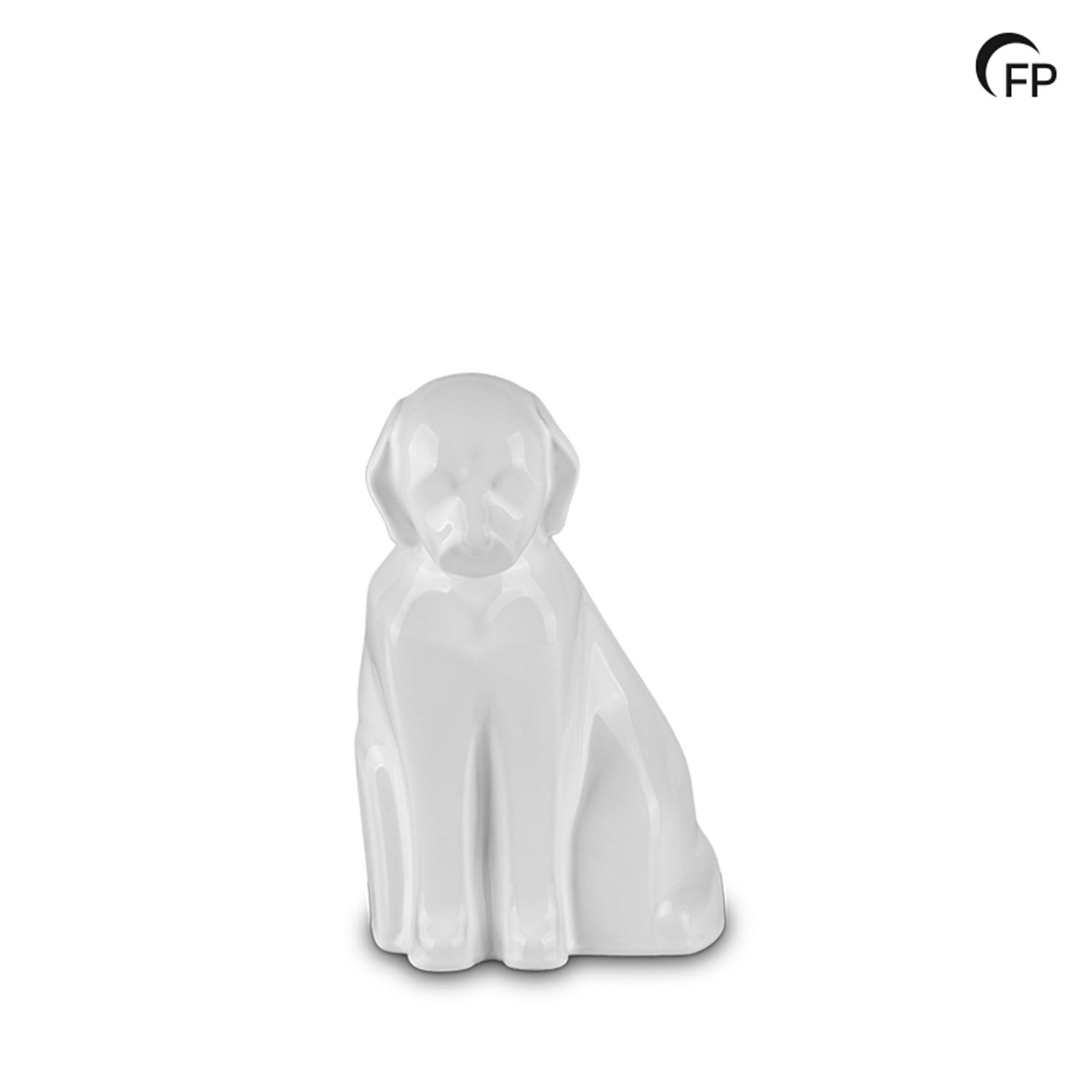 Diese Keramikurne in Form eines Hundes ist in glänzendem Weiß gehalten, was ihr eine stilvolle und zeitlose Ausstrahlung verleiht. Das Design ist eine liebevolle Hommage an ein treues Haustier. Die Hunde-Urne ist auch in einer größeren Version erhältlich.