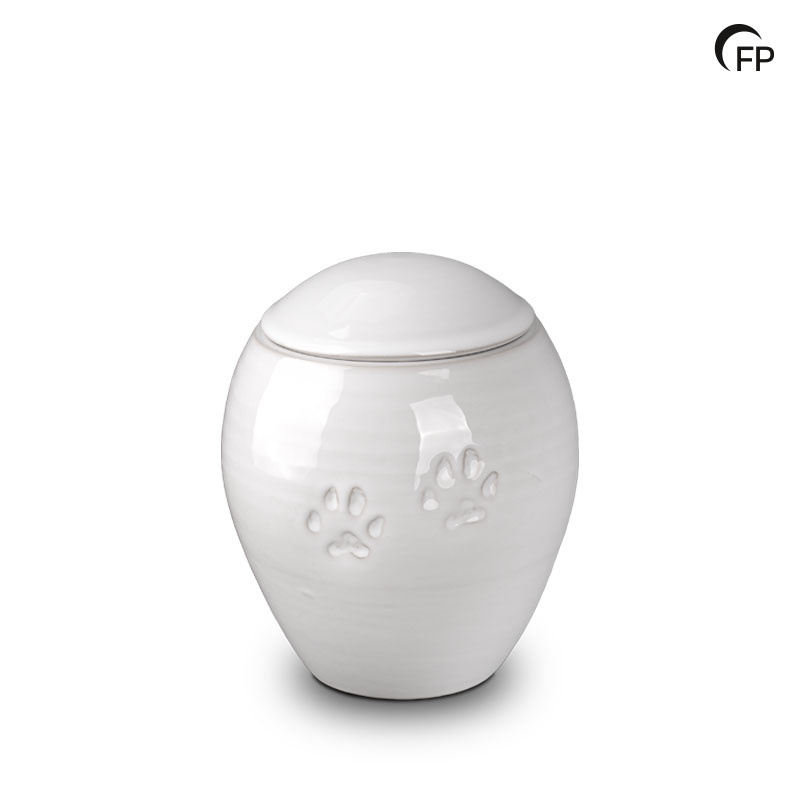 Die Keramikurne der Größe L in glänzendem Weiß hat eine klassische Form und ist mit dezenten Tierpfoten verziert, die die bleibende Liebe zu Ihrem treuen Haustier zum Ausdruck bringen. Die Urne kann an der Unterseite befüllt und mit einem Silikondeckel sicher verschlossen werden. Neben Weiß ist die Urne auch in Schwarz und in vier verschiedenen Größen erhältlich.