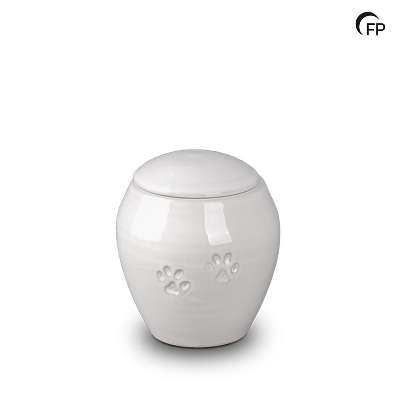 Die Keramikurne in glänzendem Weiß hat eine traditionelle Form und subtile Tierpfoten, die die bleibende Liebe zu Ihrem treuen Haustier symbolisieren. Die Urne wird an der Unterseite befüllt und mit einem Silikondeckel verschlossen, um eine sichere Aufbewahrung zu gewährleisten. Neben Weiß ist die Urne auch in Schwarz und in vier verschiedenen Größen erhältlich.