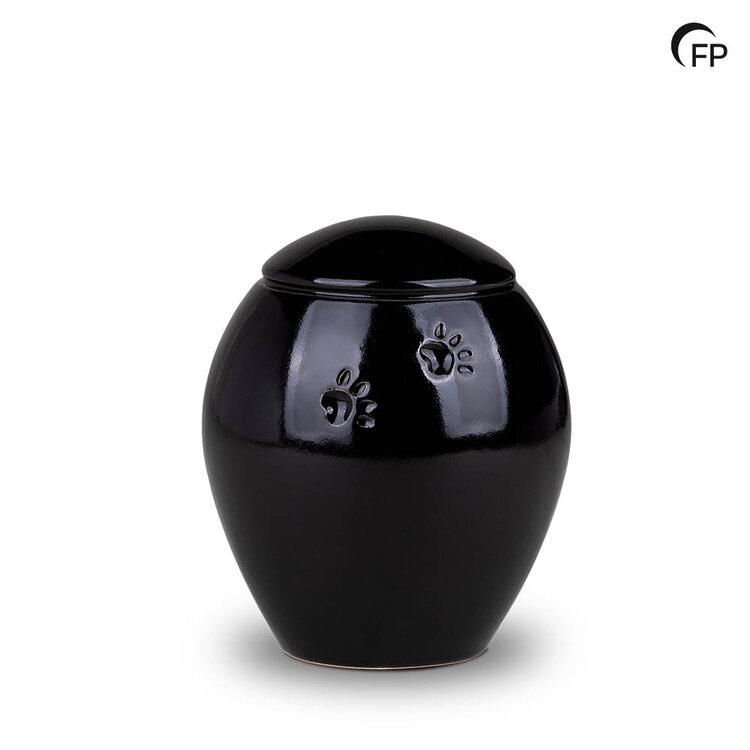 The size L ceramic urn in glossy black has a classic shape and is decorated with subtle animal paw prints, expressing your lasting love for your loyal pet. The urn can be filled from the bottom and securely closed with a silicone cap. In addition to black, the urn is also available in white and in four different sizes.