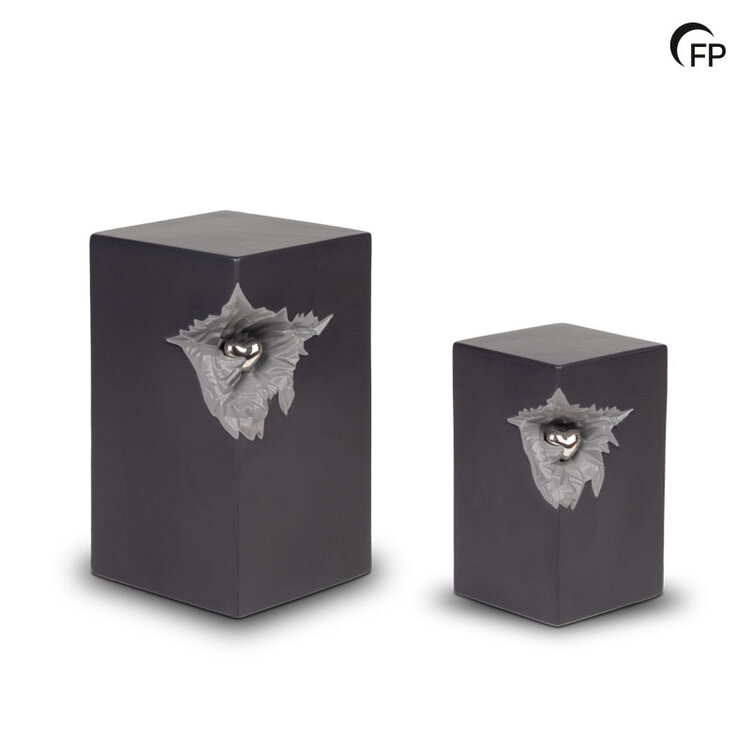 Esta urna cúbica de cerámica combina un diseño elegante y moderno con una cálida expresión de amor. El diseño refleja la ruptura que supone la pérdida de un ser querido, mientras que el llamativo corazón simboliza el amor eterno. La urna se encuentra disponible en una versión reducida y en otros dos colores.