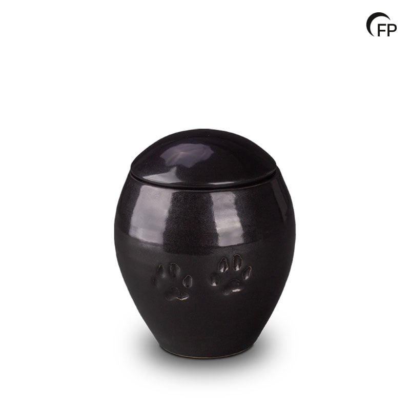 La urna de cerámica tamaño L, en color negro brillante, tiene un diseño clásico y está decorada con unas delicadas patitas de animal, que expresan el amor incondicional por su fiel mascota. La urna se llena por la parte inferior y se cierra de forma segura con una tapa de silicona. Además del color negro, ahora esta urna también está disponible en color blanco y en 4 tamaños diferentes.