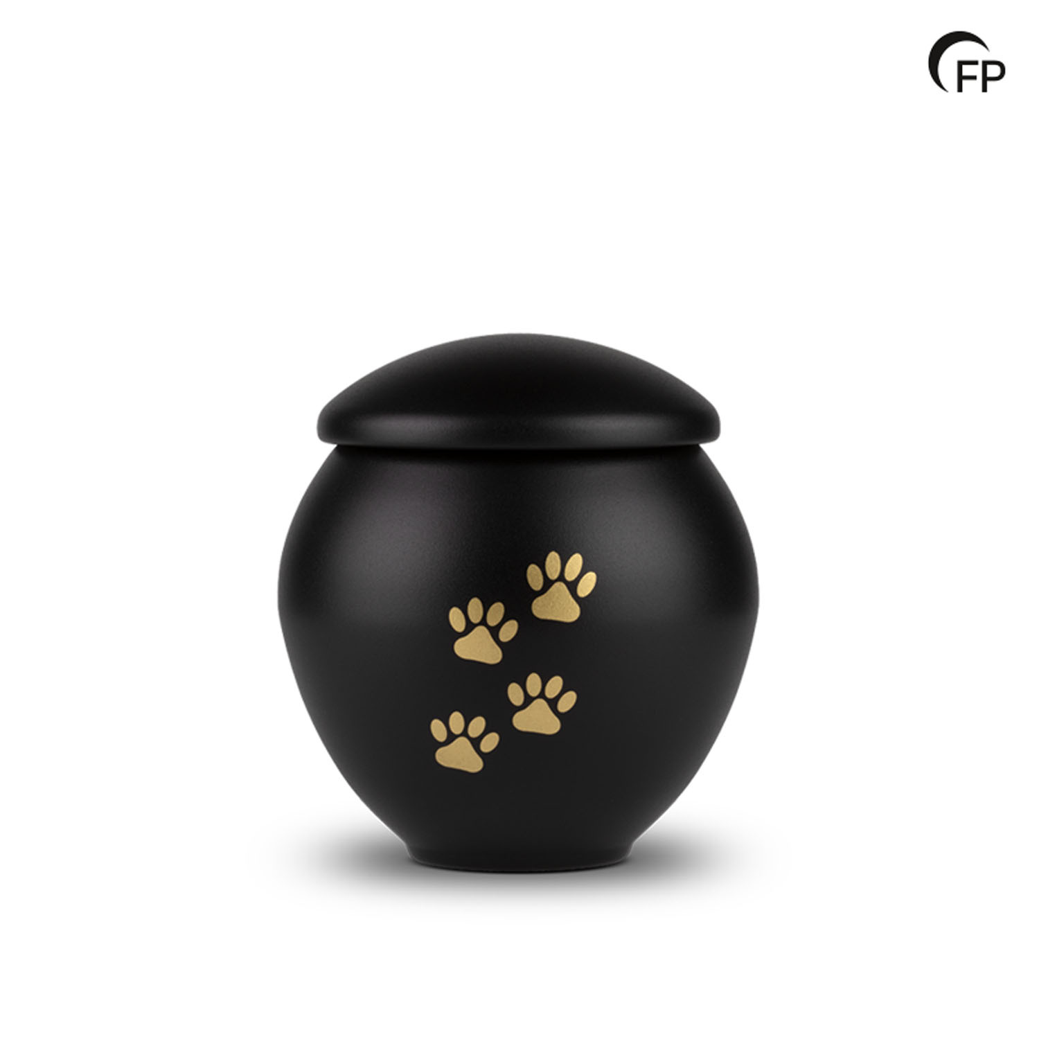 Deze grote metalen dierenurn in zwart (eternal black) is een elegant en waardig eerbetoon aan een geliefd huisdier. De goudkleurige pootjes vormen een verfijnd detail. Deze metalen dierenurn is ook beschikbaar in andere kleuren en twee kleinere formaten.