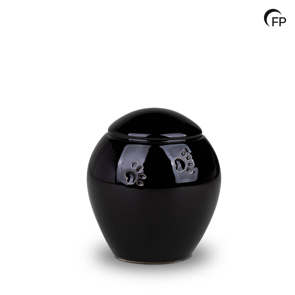 De keramische urn in glanzend zwart heeft een traditionele vorm en subtiele dierenpootjes, die de blijvende liefde voor uw trouwe huisdier symboliseren. De urn kan aan de onderkant worden gevuld en wordt afgesloten met een siliconen sluitdop voor een veilige bewaring. Naast zwart is de urn ook verkrijgbaar in wit en in vier verschillende formaten.